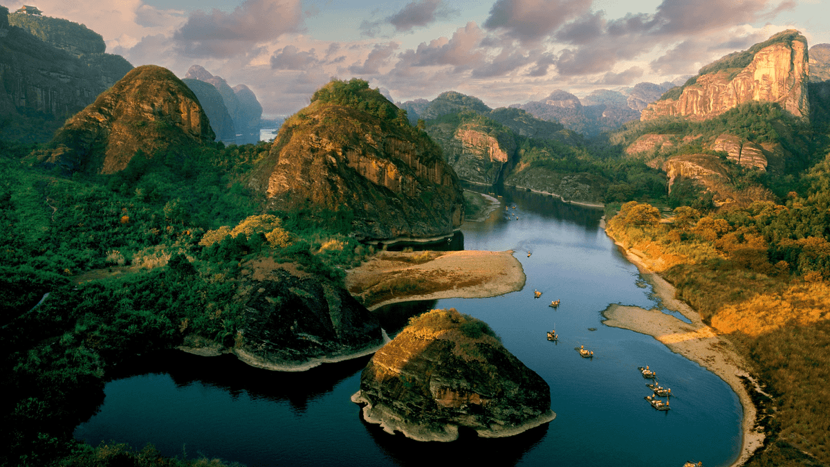 The river winds through the mountain, passing by numerous ancient Daoist sites.